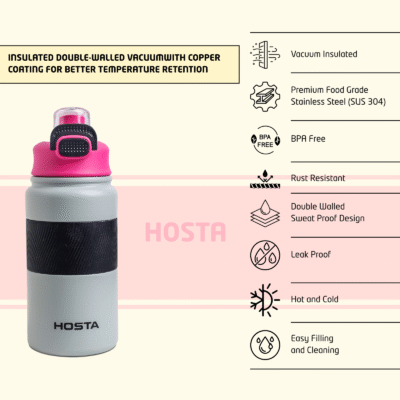 The HOSTA Stainless Steel Vacuum Insulated Water Bottle (600 ml) in elegant Grey is designed to keep your drinks hot or cold for hours. Whether you’re at the gym, school, office, or exploring the outdoors, this bottle is your reliable hydration partner.